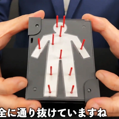 One by one, insert a sword into each hole, passing each blade right through the person!